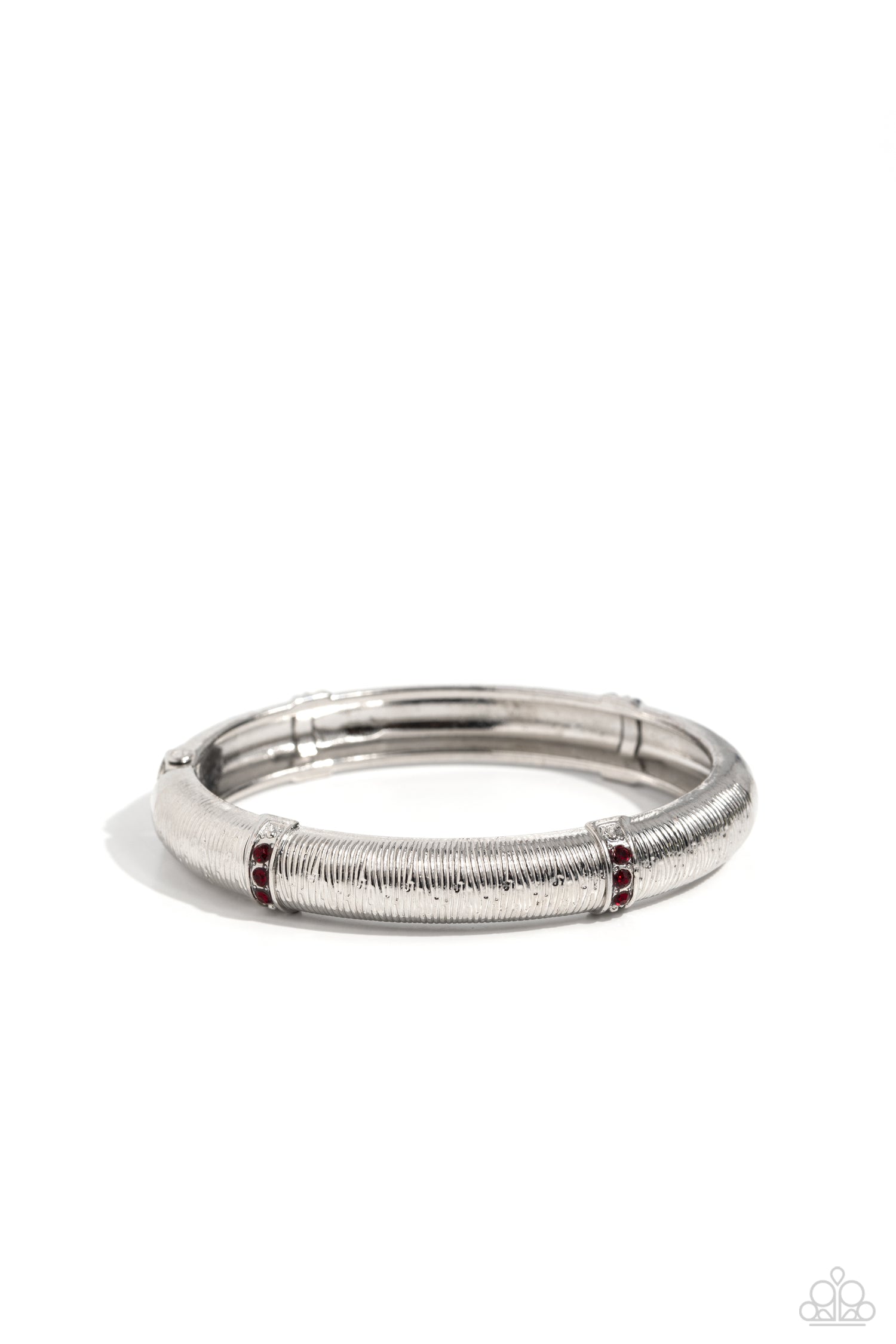 Dainty rows of fiery red rhinestones embellish the abstractly riveted front of two curved silver frames that join into a versatile bangle around the wrist. Features a hinged closure.