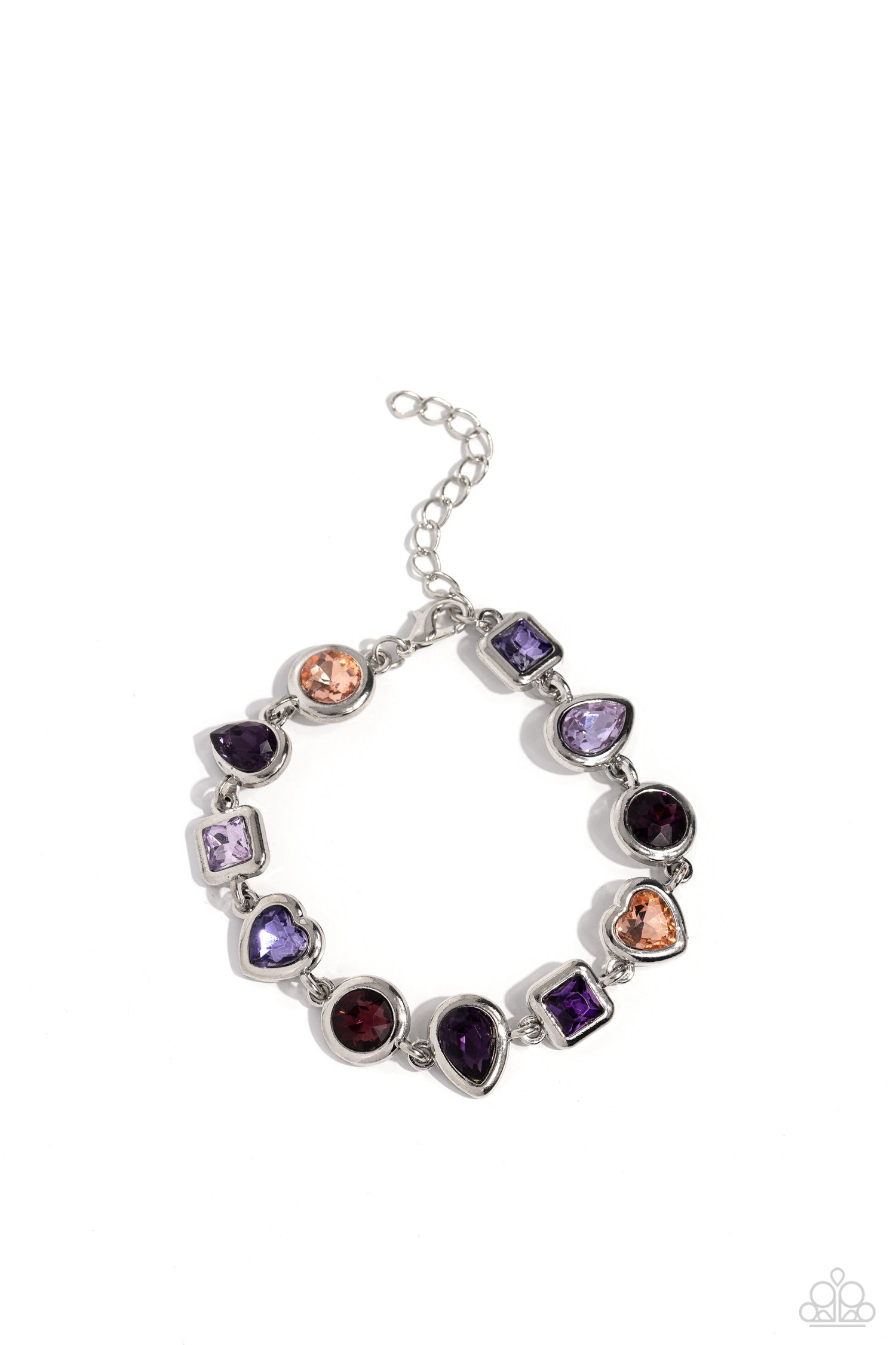 Featuring various shapes and shades of purple, a collection of teardrop, round, heart, and square-cut gems in matching silver frames coalesce around the wrist for an abstract display of color and charm. Features an adjustable clasp closure.