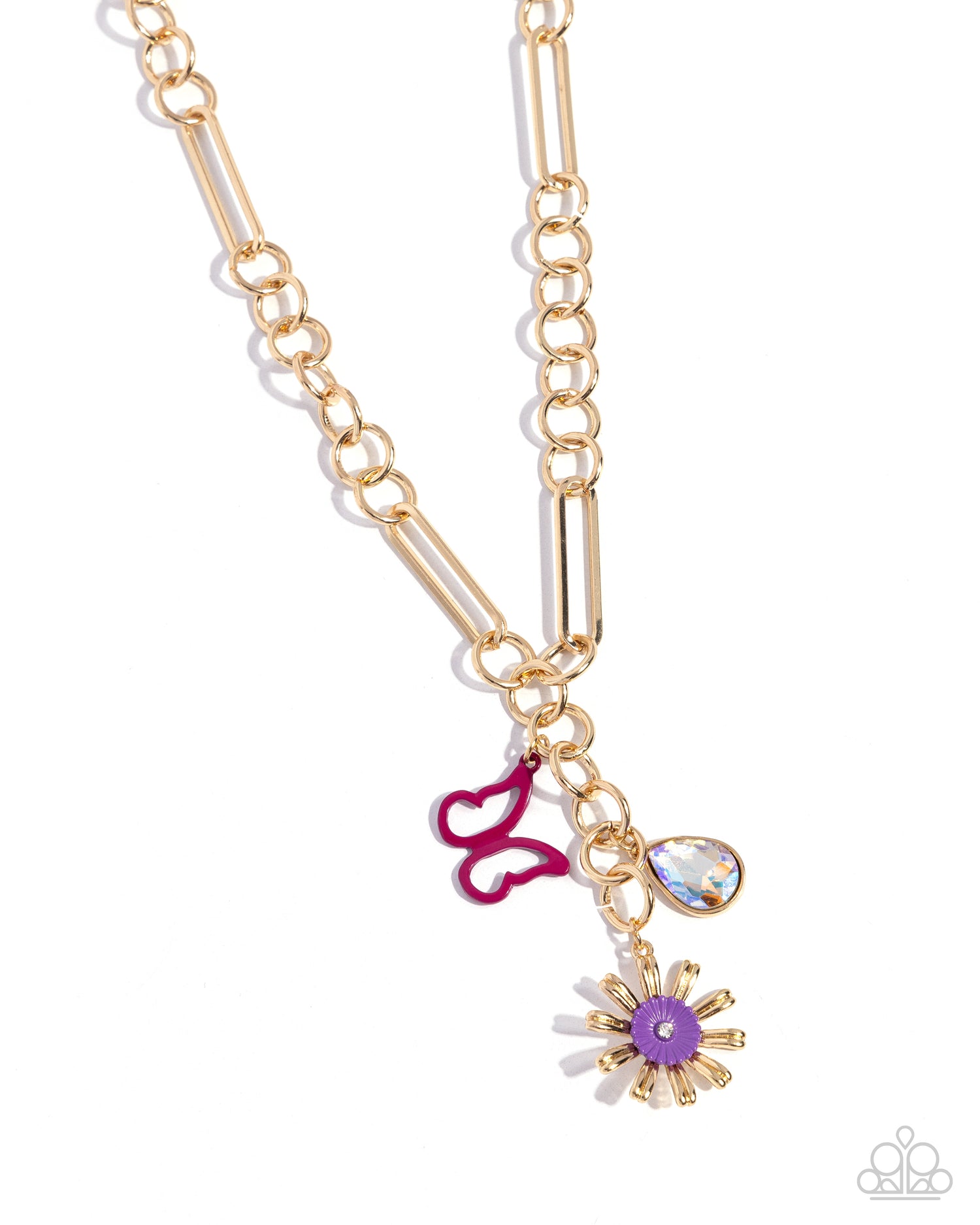 Cascading along an abstract gold chain, a collection of whimsical charms including an orchid-painted butterfly silhouette, a lavender-painted gold flower, and an iridescent teardrop gem extends below the neckline for a glittery finish. Features an adjustable clasp closure.
