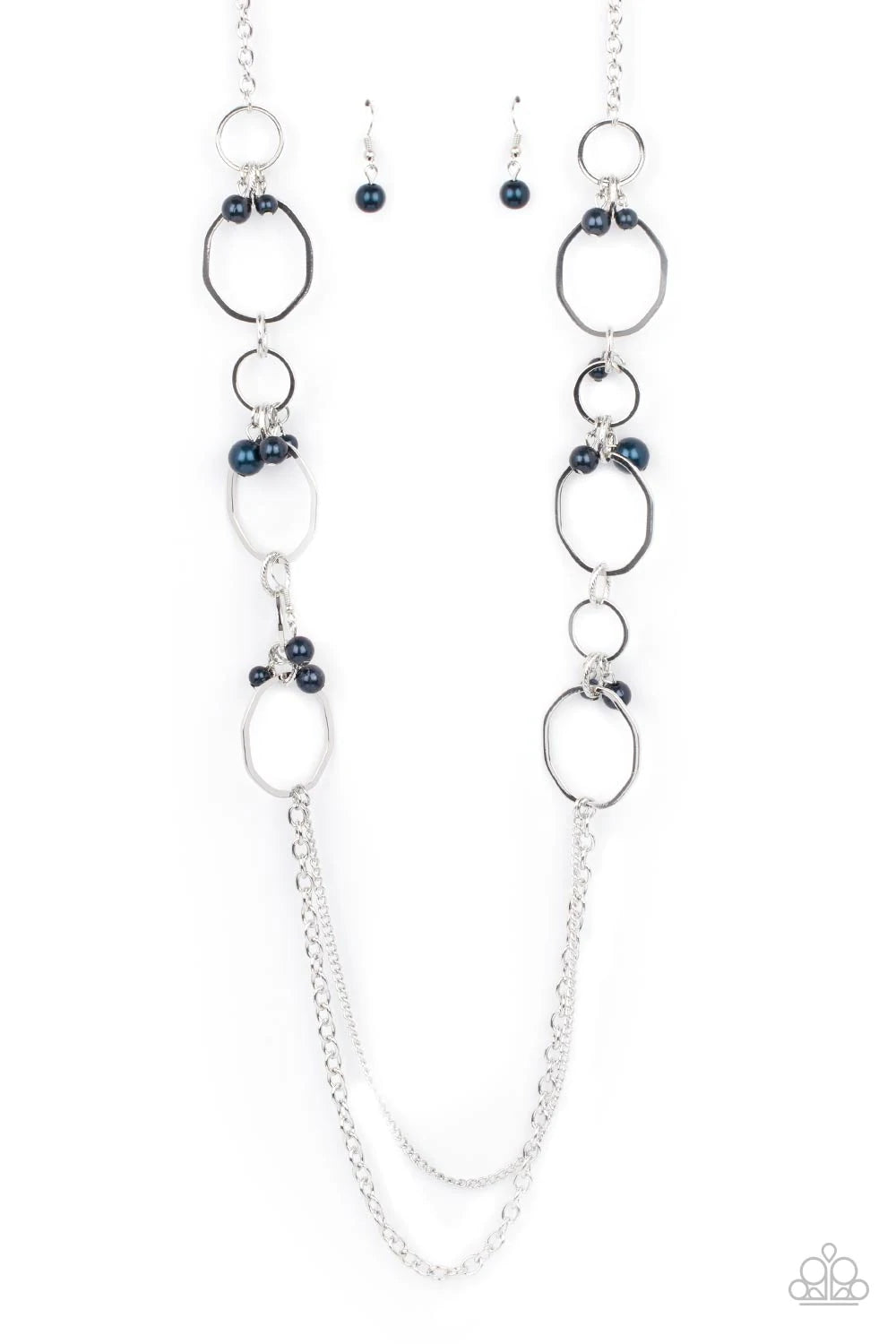 Oversized bent silver hoops accented with Montana Blue pearl charms link together for a refined upscale design. A set of mismatched chains at the end of the lengthened necklace adds balance. Features an adjustable clasp closure.