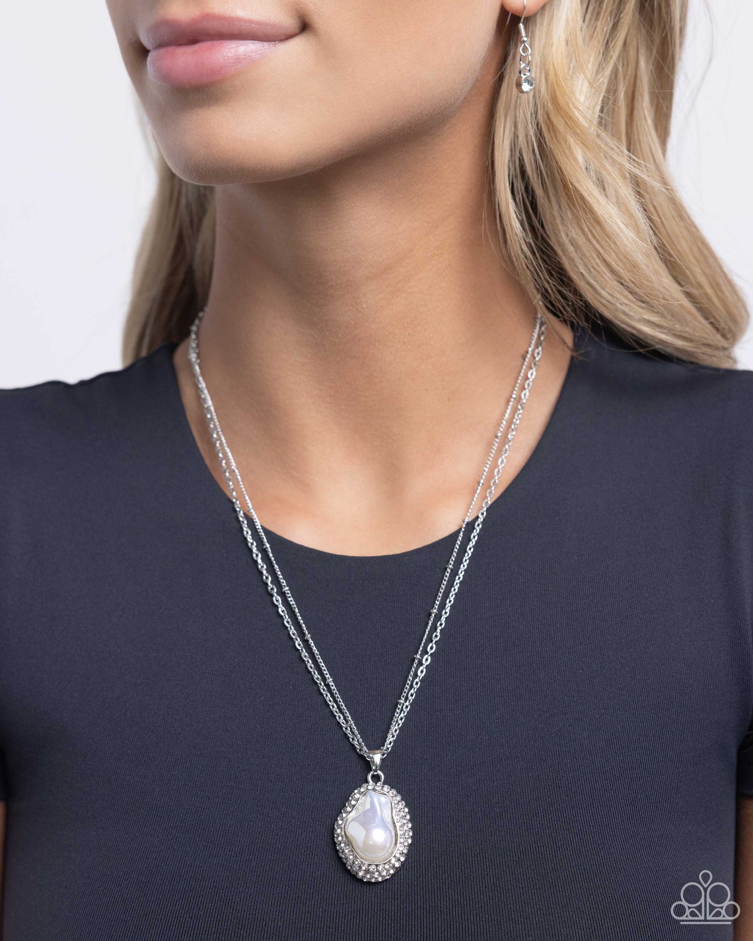 A silver satellite chain and classic chain combine into one shimmering display below the neckline. Embellished in glistening white rhinestones, an abstract baroque white pearl is pressed into an oversized silver frame for a beach-inspired basic. Features an adjustable clasp closure.