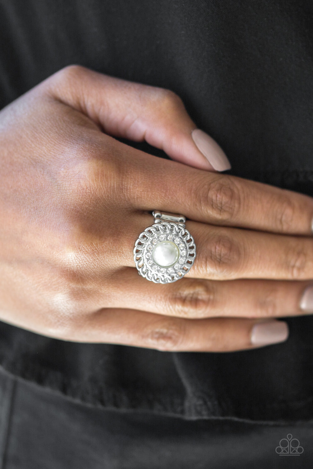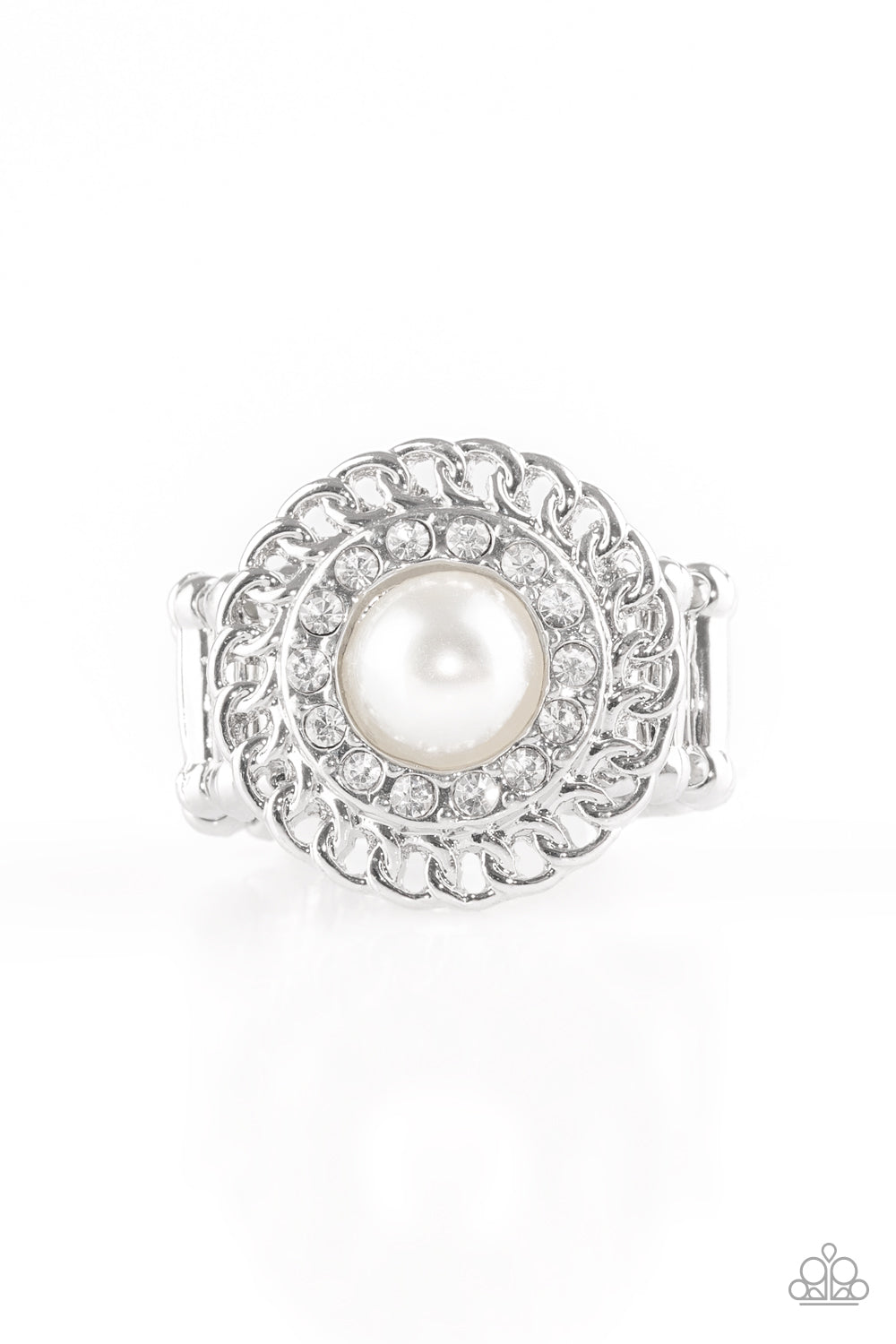 Shimmery silver chain link spins around a ring of glittery white rhinestones, creating an edgy frame. A pearly white bead is pressed into the center of the frame for a glamorous finish. Features a stretchy band for a flexible fit.