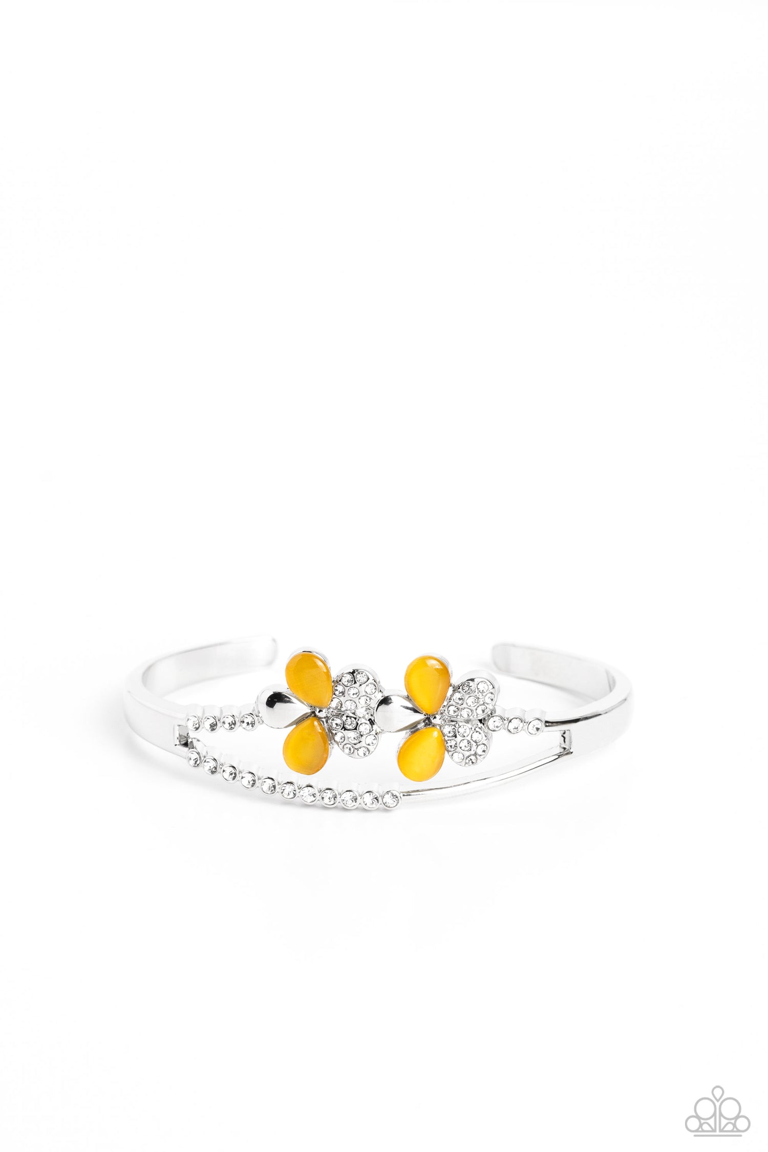 Splitting off from a high-sheen silver cuff, silver scalloped fittings featuring tiny white rhinestones create an airy opening at the center of the wrist. Infused along the uppermost scalloped fitting, two side-by-side flowers with petals of yellow cat's eye stones, bedazzled white rhinestones, and silver finish the design off with a refined pop of color.