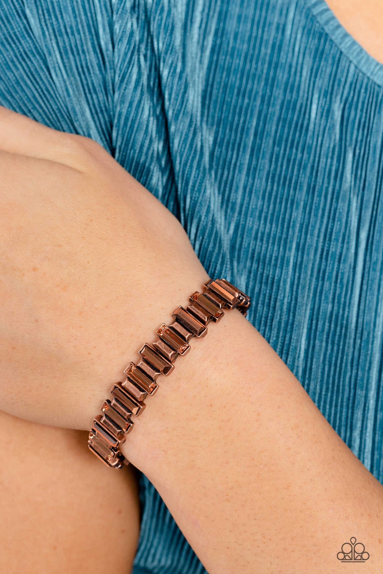 Set in clusters around the wrist on elastic stretchy bands, a collection of shiny copper bars with a metallic and reflective finish glimmer for an industrial, glitzy, statement piece.