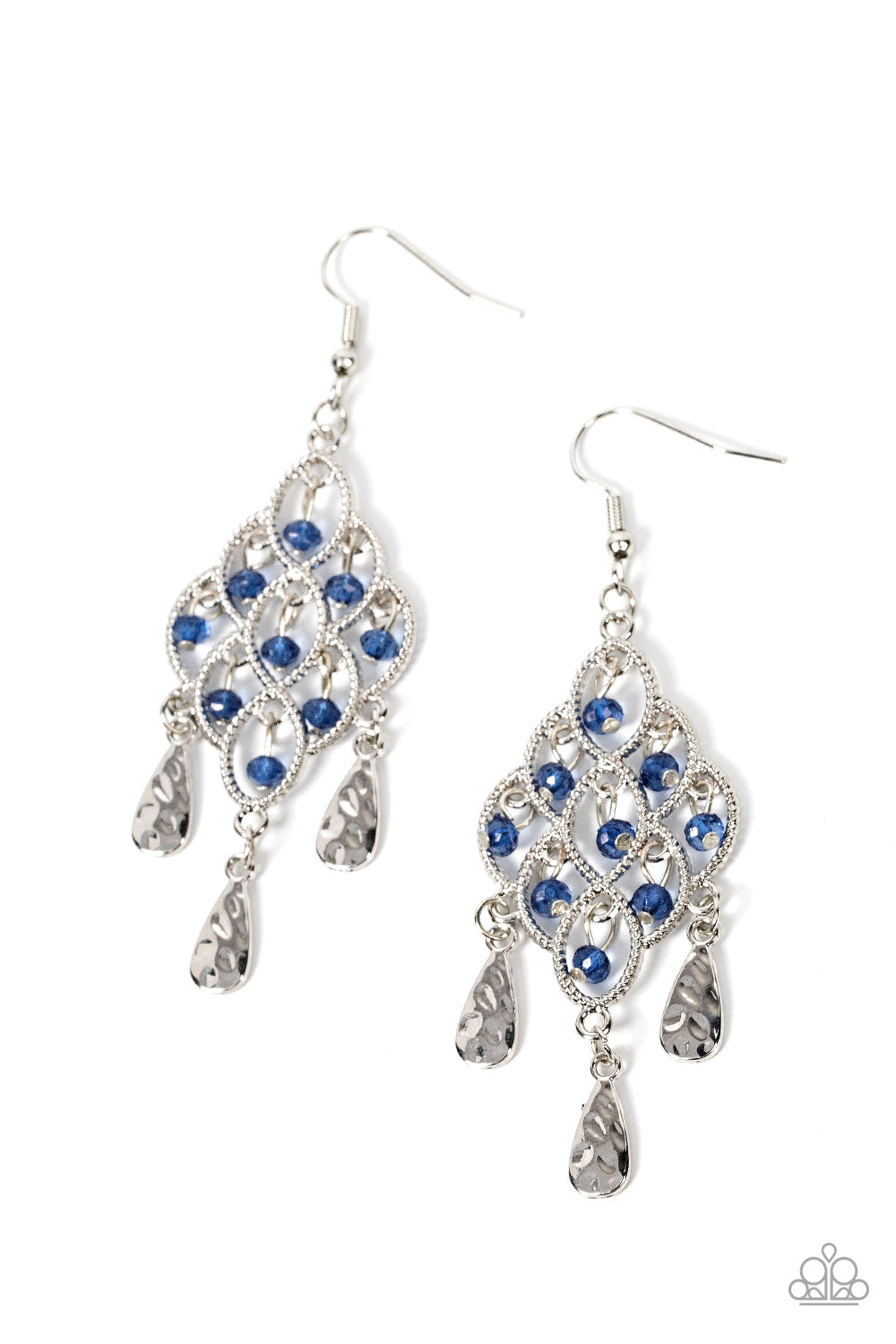Hammered silver teardrops swing from the bottom of a frame composed of silvery ropelike filigree that gently loops into an airy diamond shape. Tiers of dainty blue crystal-like beads cascade from the frilly frame, adding shimmery glints of color. Earring attaches to a standard fishhook fitting.