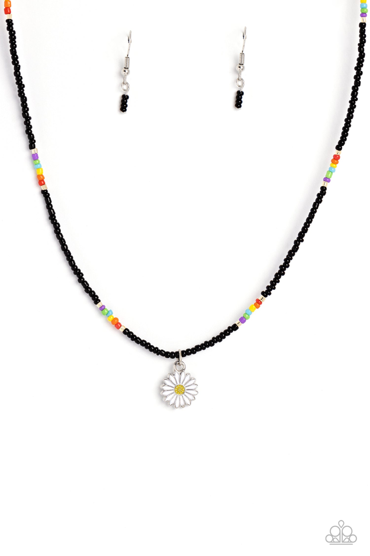 Infused along an invisible string, black seed beads combine with a scattered collection of multicolored seed beads for a charming display along the neckline. An intricately-detailed white daisy charm dangles from the design for some seasonal movement. Features an adjustable clasp closure.