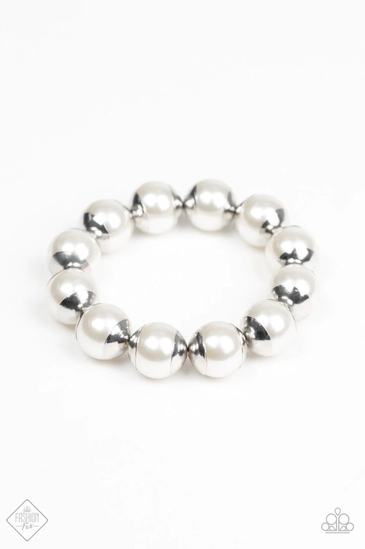 Capped in silver fittings, oversized silver pearls are threaded along a stretchy band around the wrist for a refined look.