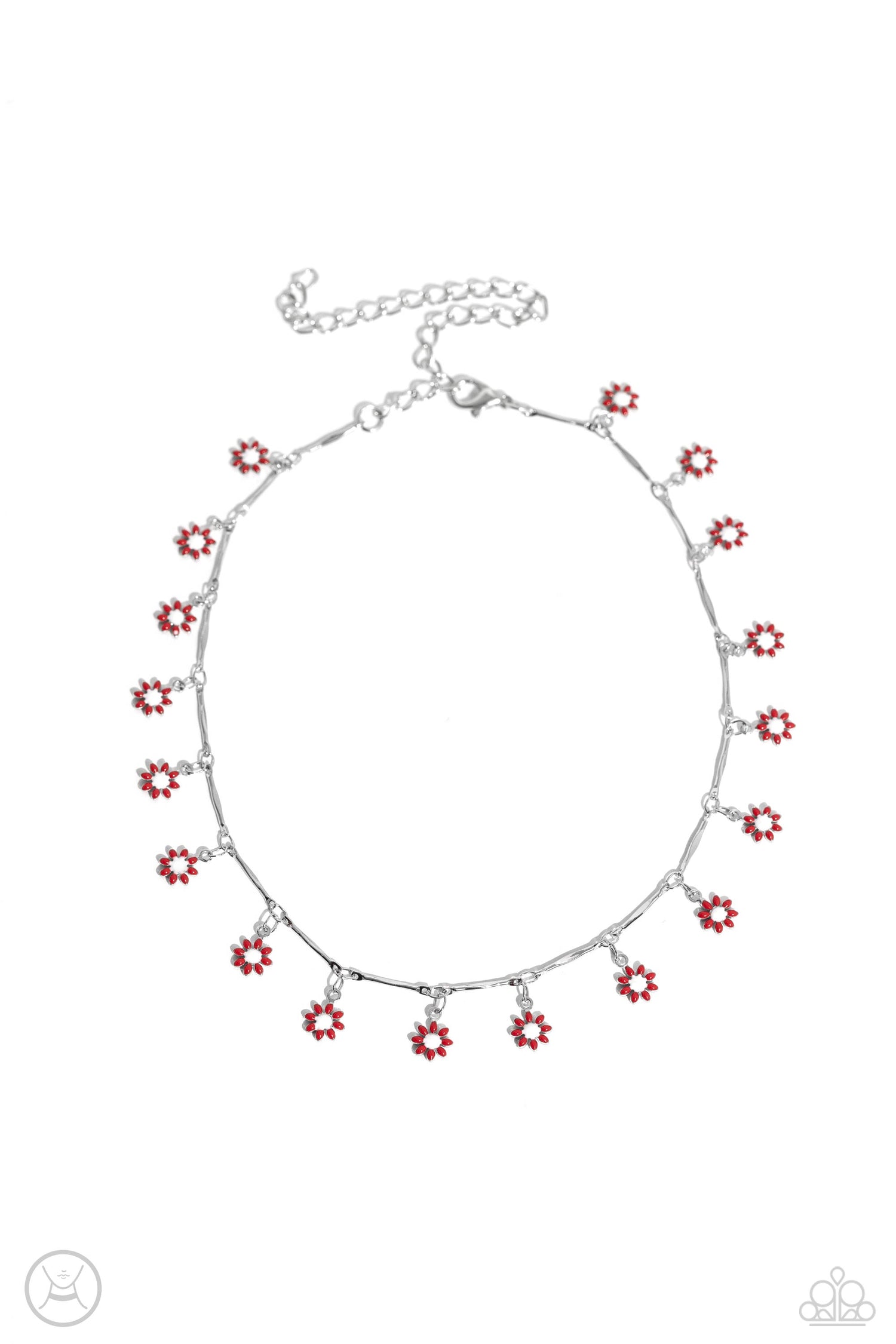 Featuring bright white centers, dainty red-petaled silver flowers drip between shiny silver bars along the collar, creating a dainty, floral fringe. Features an adjustable clasp closure.