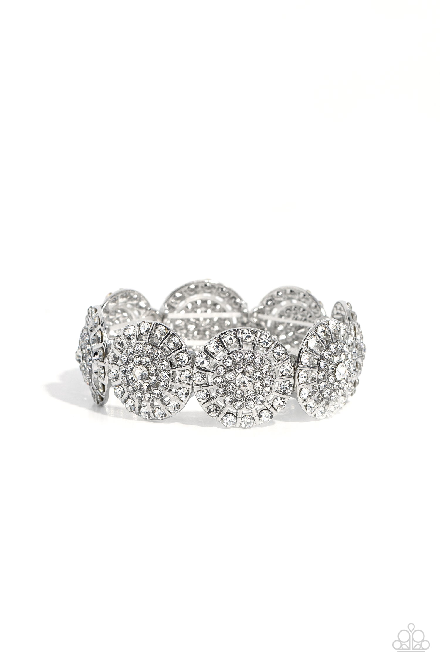 Featuring a wheel motif, concaved silver discs embossed in an explosion of white rhinestones slide along a stretchy band around the wrist for a hint of dazzling refinement.