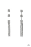 Enveloped in white rhinestones, three interconnected square frames cascade down the ear resulting in a dazzling drop of glitz. Featuring sleek square fittings, strands of glittery white rhinestones freefall from the lowermost gunmetal square frame, creating a glamorous fringe. Earring attaches to a standard post fitting.