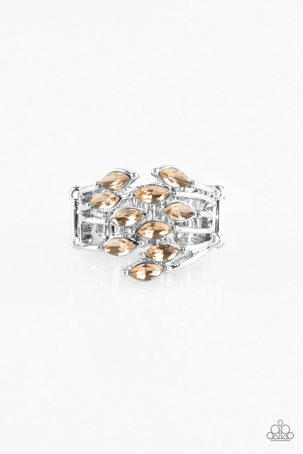 Featuring regal marquise style cuts, golden topaz rhinestones attach at the ends of dainty silver bars. The glittery gems collect at the center, creating a glamorous centerpiece atop the finger. Features a stretchy band for a flexible fit.