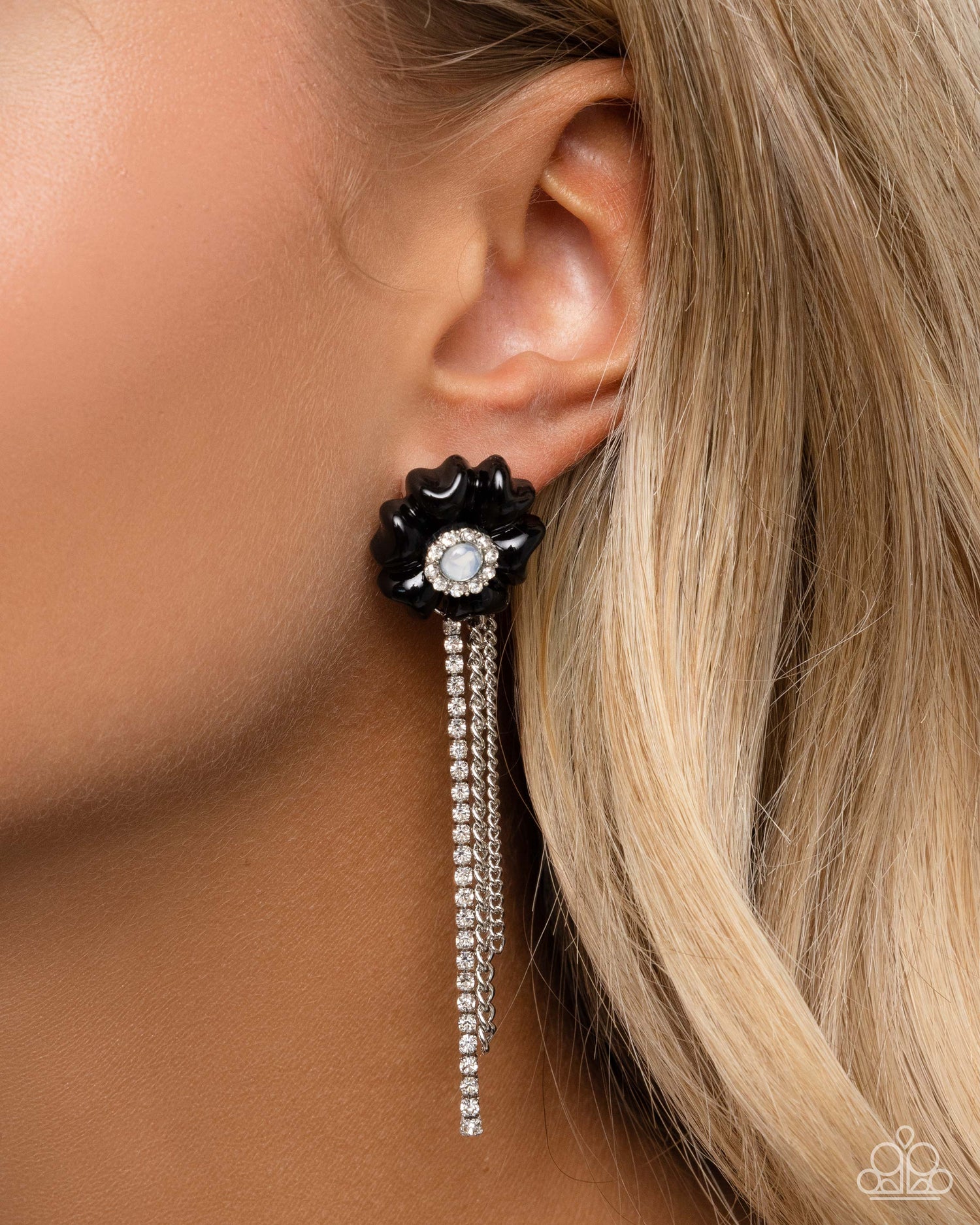Blooming from a faceted opalescent resin center, a border of glistening white rhinestones gives way to black petals for a dramatic pop of color along the ear. Mismatched silver chains, including a dainty silver chain, classic chain, and white rhinestones in square fittings taper in a dramatic sway below the floral post for additional eye-catching interest. Earring attaches to a standard post fitting.