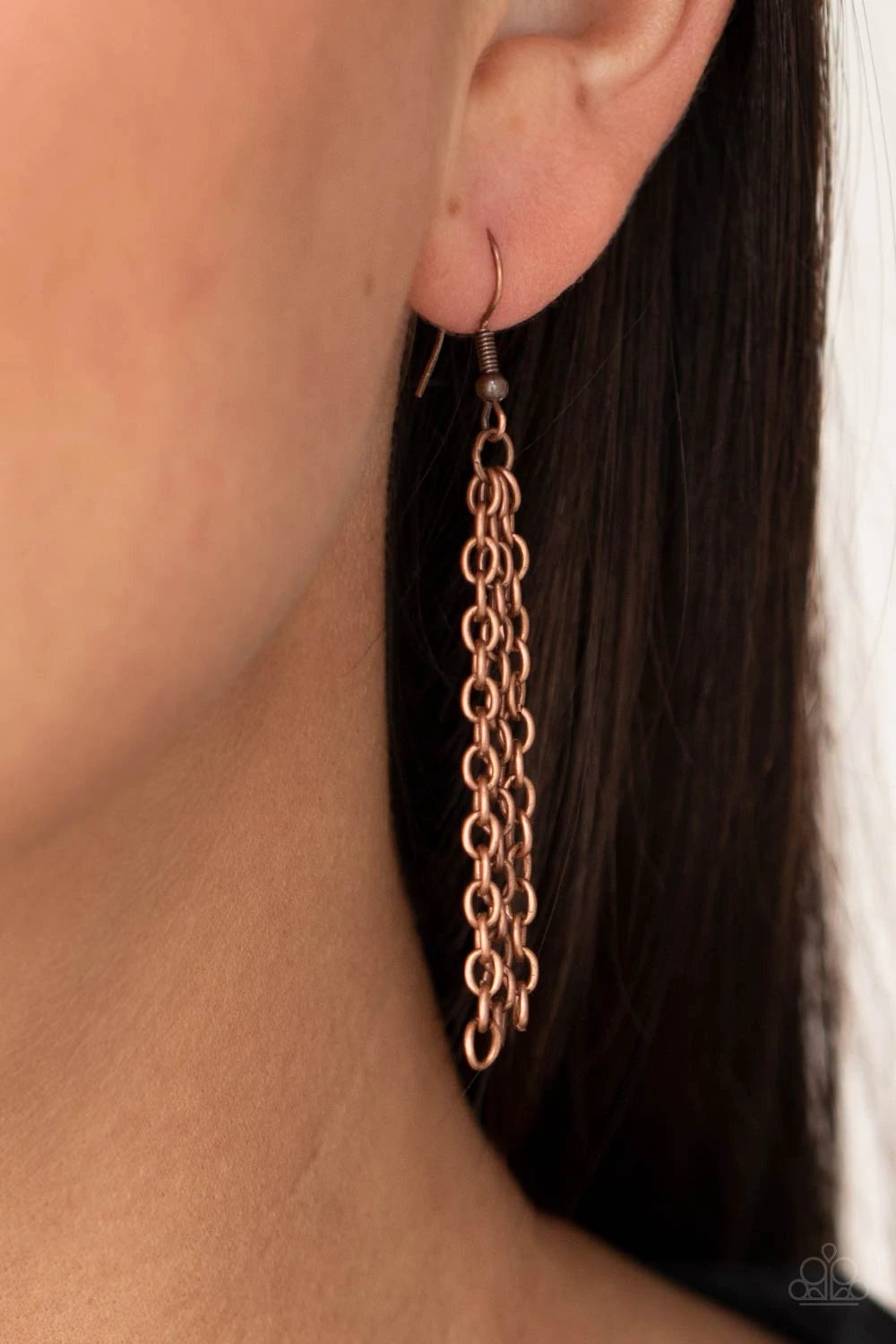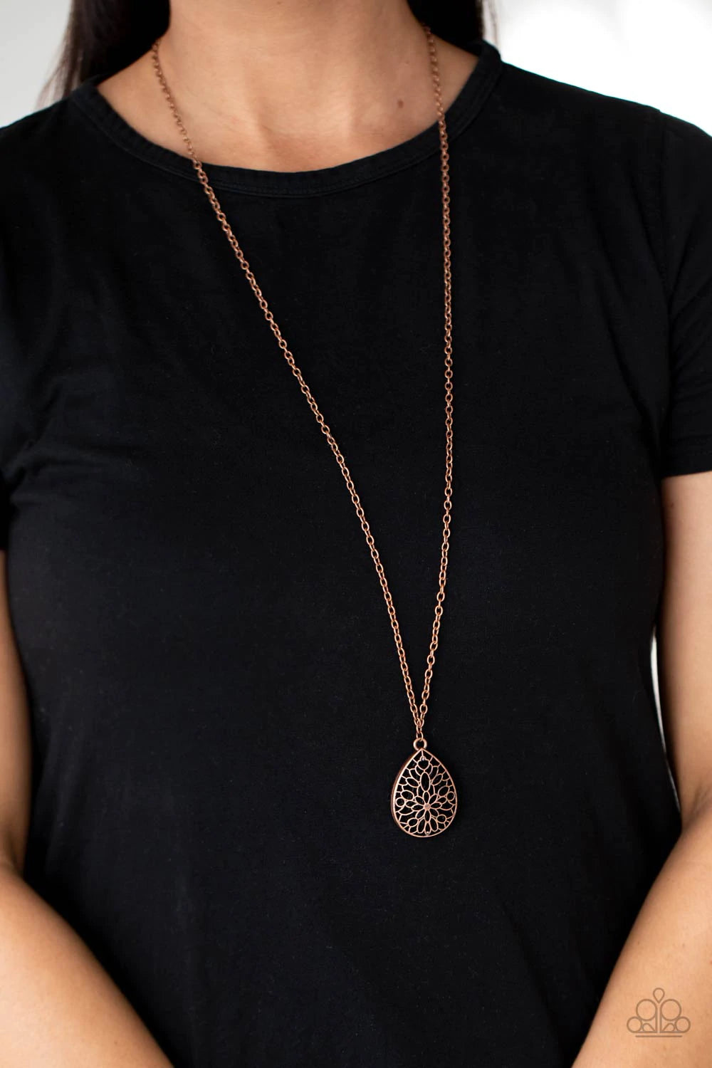 Brushed in a rustic shimmer, stenciled copper frames stack into an airy three-dimensional teardrop pendant at the bottom of a lengthened copper chain. Features an adjustable clasp closure.