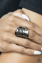 Featuring a high sheen, a hammered gunmetal disc, divided in half by a raised spine, floats up on each end for a gleaming high-stakes finish. Features a stretchy band for a flexible fit.