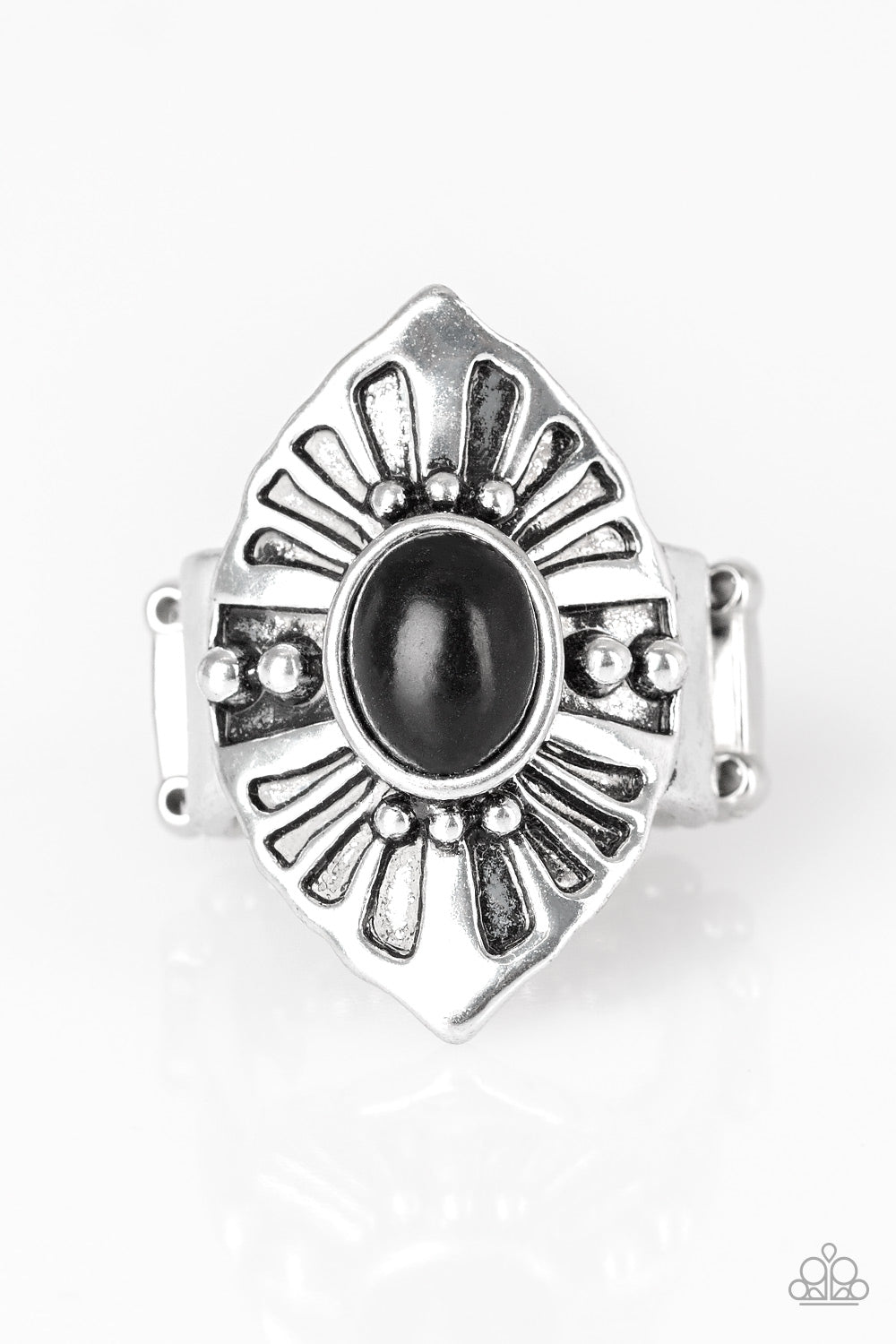 A black stone bead is pressed into the center of an angular silver frame radiating with studded and antiqued textures. Features a stretchy band for a flexible fit.
