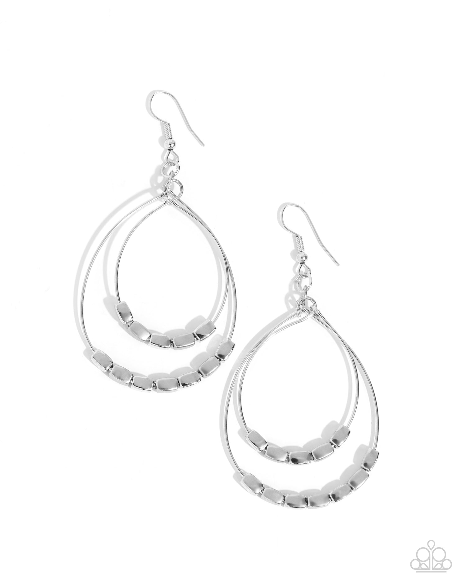 Dainty rectangular beads glide along the bottoms of two silver wires that delicately bend into a layered teardrop. Earring attaches to a standard fishhook fitting.