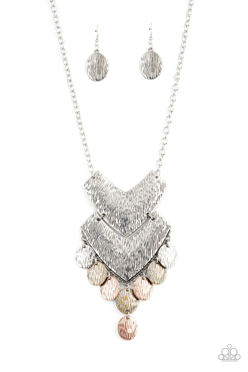 Etched in rustic silver textures, a pair of oversized chevron-like silver frames delicately link into a wild statement piece. Matching textured silver, brass, and copper discs swing from the bottom of the stacked display, adding a noisemaking movement to the rambunctious pendant. Features an adjustable clasp closure.