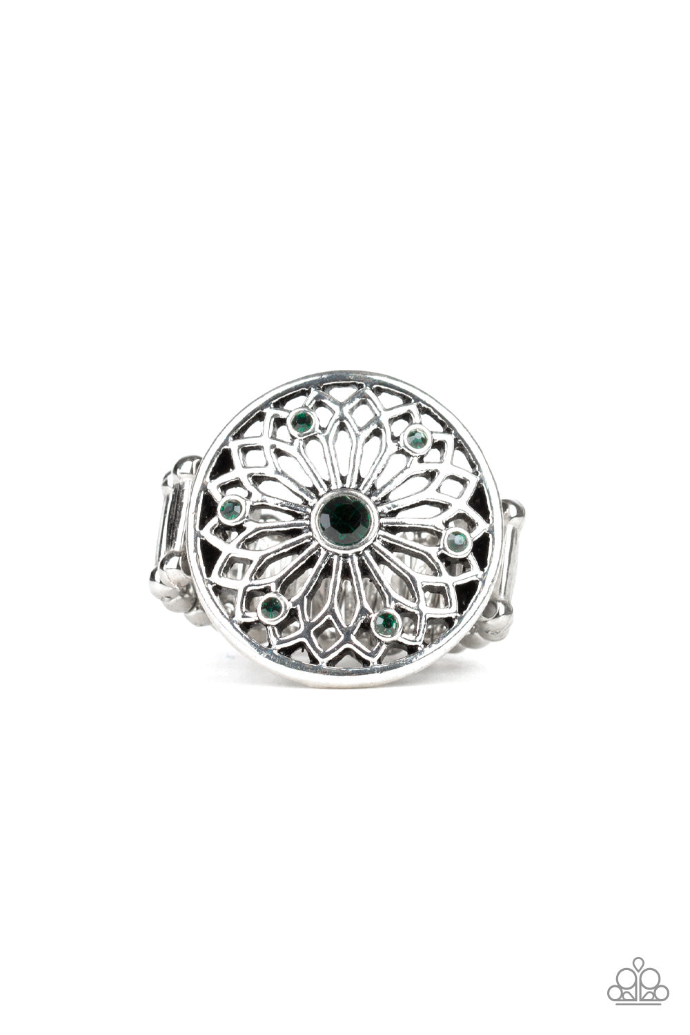 Glittery green rhinestones are sprinkled across a shimmery floral center, creating a whimsical mandala-like frame atop the finger. Features a stretchy band for a flexible fit.