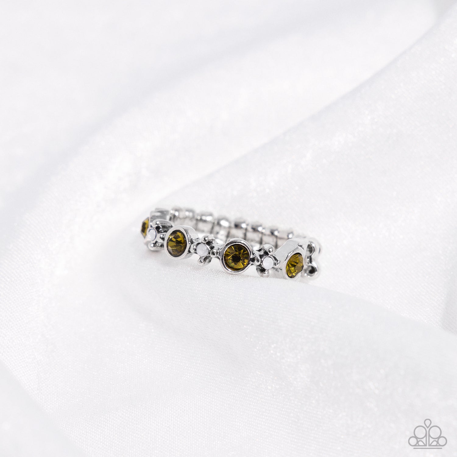 Dainty opal and glassy green rhinestones alternate across the finger, coalescing into an effervescent centerpiece. Features a dainty stretchy band for a flexible fit.