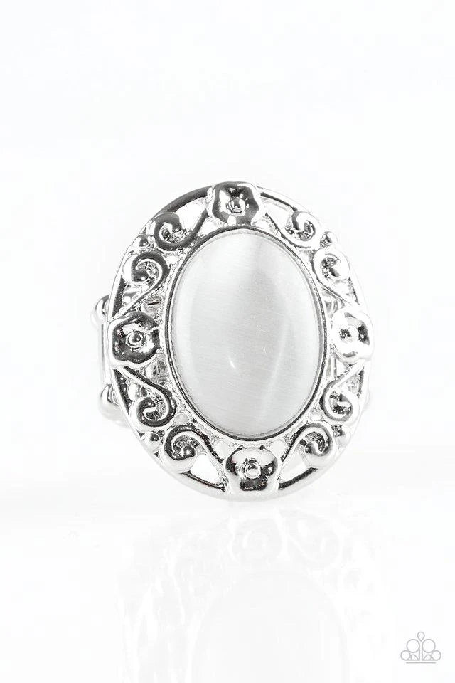 Shimmery floral-like filigree swirls around a glowing white moonstone center, creating a whimsical centerpiece atop the finger. Features a stretchy band for a flexible fit.