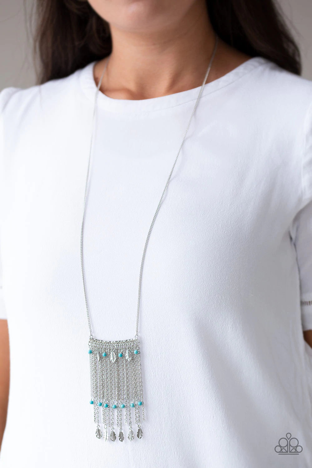 Attached to a lengthened silver chain, a hammered silver bar gives way to a fringe of shimmery silver chain, dainty turquoise stone beads, and silver feather frames for a seasonal look. Features an adjustable clasp closure.