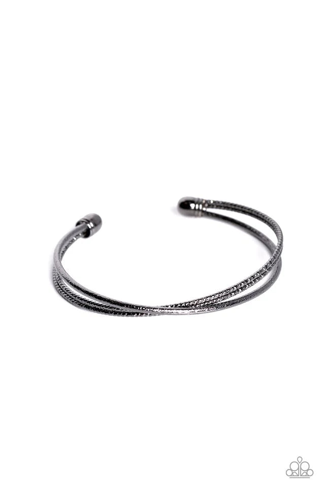 One strand of glittery gunmetal and one double strand of textured gunmetal crisscross across the wrist, coalescing into a versatile cuff around the wrist.