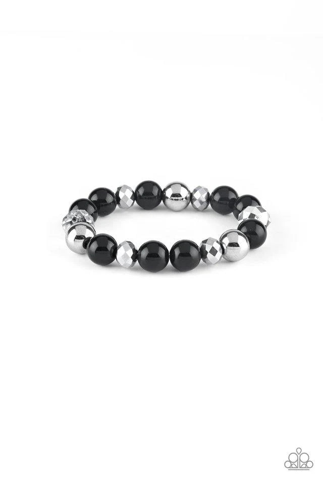 A collection of pearly black, classic silver, and crystal-like hematite beads are threaded along a stretchy band, creating a refined look around the wrist.
