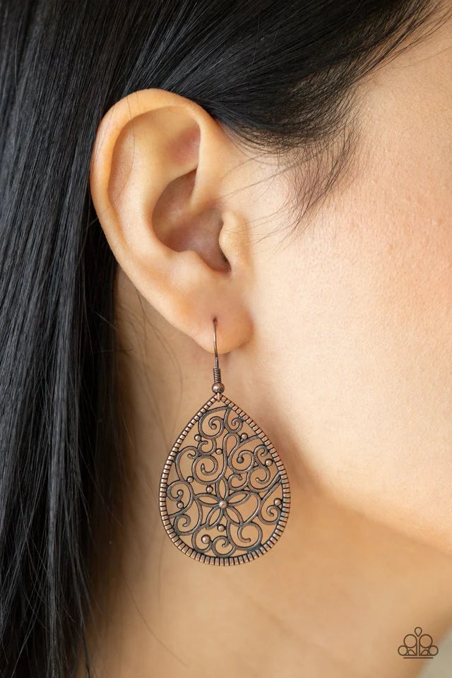 Delicate swirls of studded copper filigree dance gracefully within a textured teardrop, evoking a sense of whimsy and artistry. This enchanting floral motif transforms each earring into a unique piece of wearable art. Finished with a standard fishhook fitting, these earrings are perfect for adding a touch of elegance and charm to any outfit.