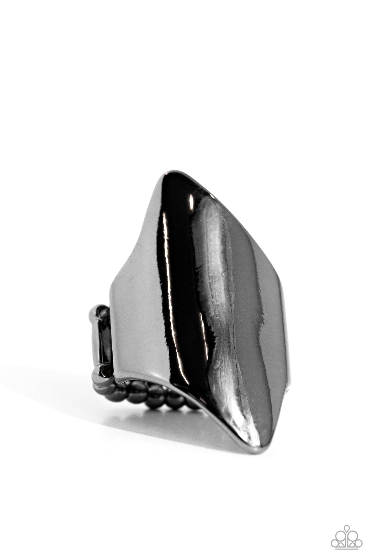 A thick band of glistening gunmetal arcs across the finger, with two sharp points jutting out at the ends, coalescing into a bold, asymmetrical centerpiece. Features a stretchy band for a flexible fit.