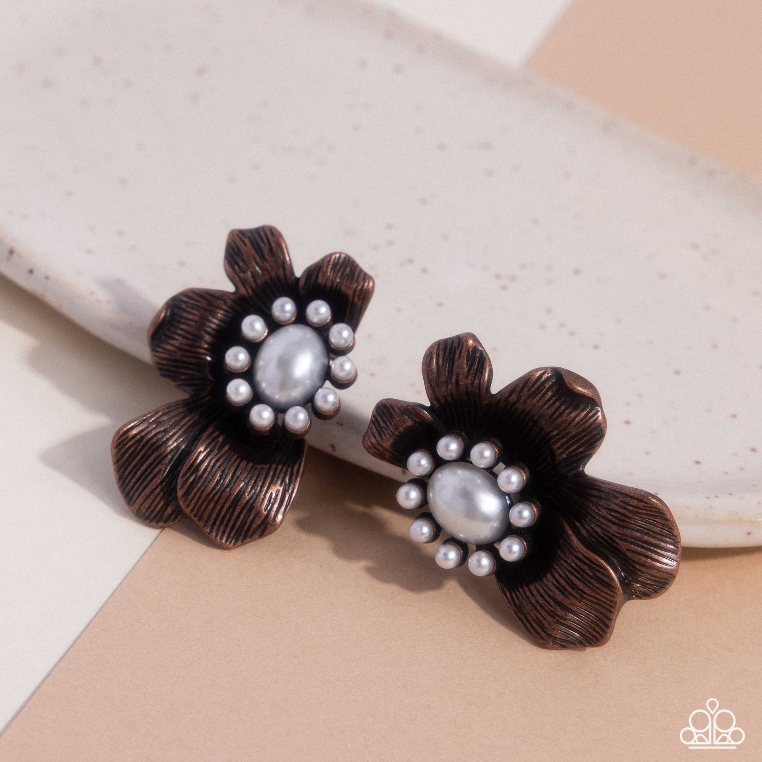 Textured copper petals bloom from a white pearl floral center, layering into a radiantly rustic half-blossom for a whimsical flair. Earring attaches to a standard post fitting.