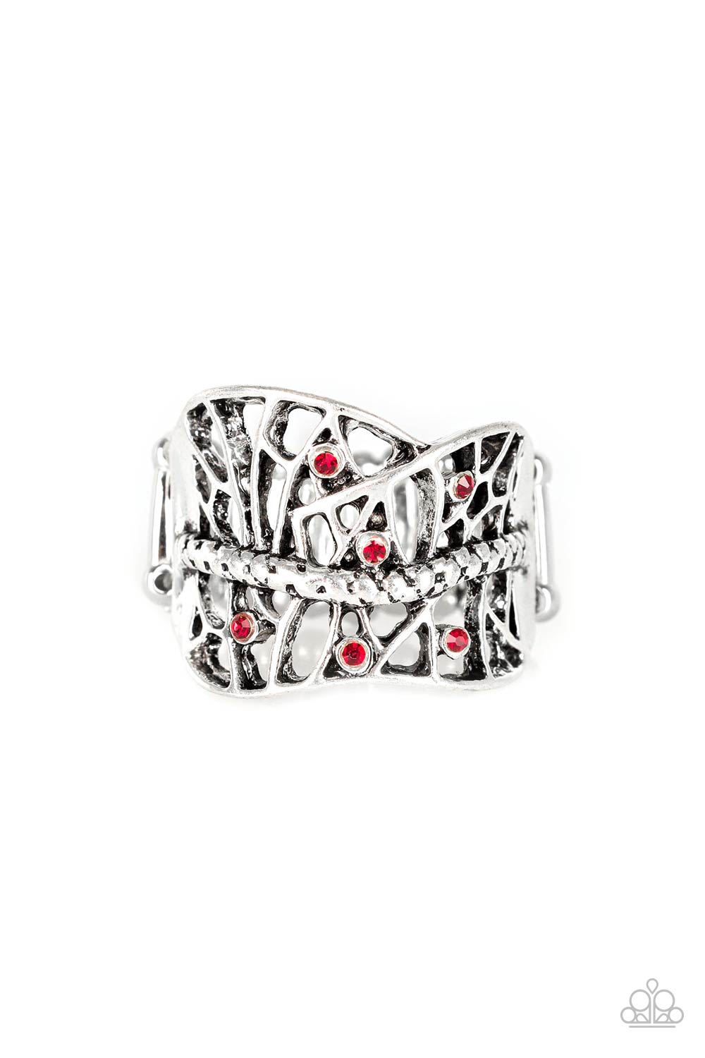Dainty red rhinestones are sprinkled along a shattered silver frame, creating an edgy centerpiece atop the finger. Features a stretchy band for a flexible fit.