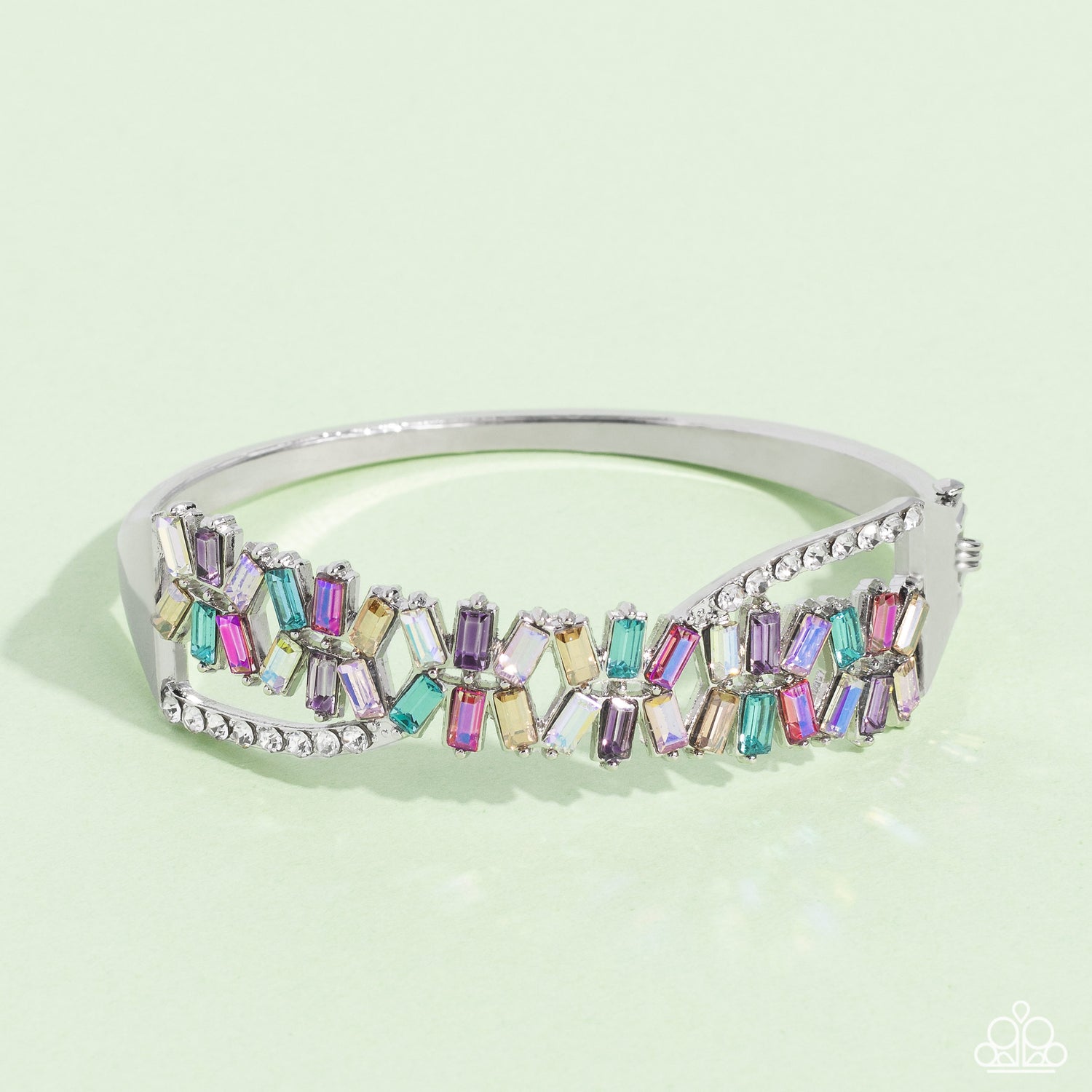 Modeled after the infinity symbol curves, a row of dainty white rhinestones playfully interacts with emerald-cut gems splashed in shades of amethyst, light blue, pink, smoked topaz, and iridescence. Set in clusters of three, the emerald-cuts haphazardly stack on top of one another for a timeless, geometric radiance atop the wrist. Due to its prismatic palette, color may vary. Features a hinged closure.