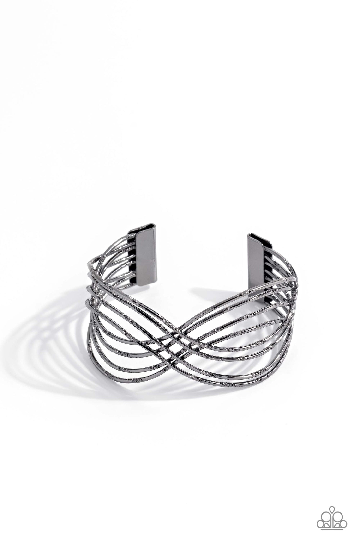 Etched in sections of diamond cut texture, wavy gunmetal wires delicately overlap into a shimmery layered cuff around the wrist.