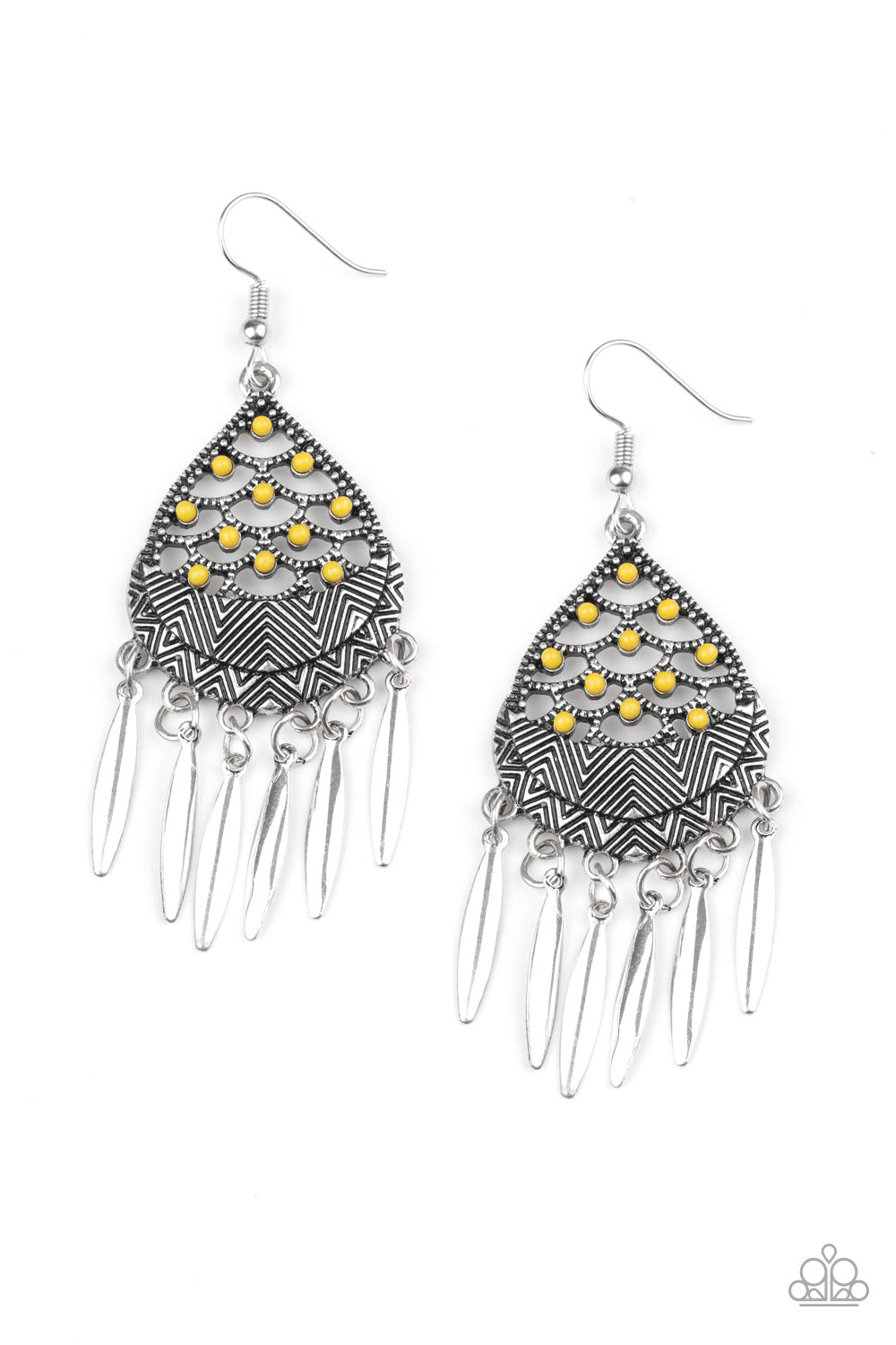 Etched in zigzagging textures, a yellow beaded silver frame gives way to a fringe of flared silver bars for a dramatic tribal inspired look. Earring attaches to a standard fishhook fitting.